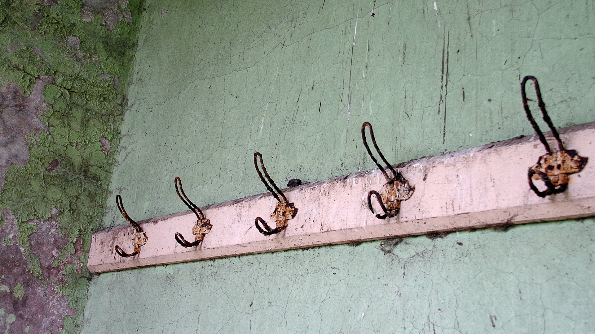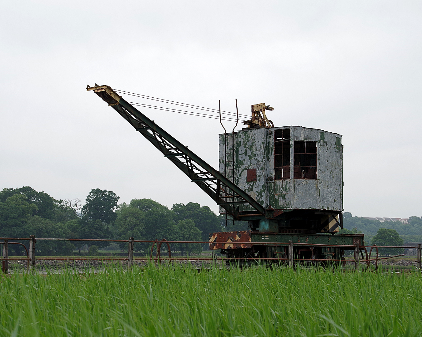 Fields now made use for grazingThe old munition buildings are not maintained and nature is slowly taking overWild thistle growing on the road vergeMunitions buildings widely separated for blast safetyCoat hooks in the entrance lobby of one of the buildingsOld jetty crane